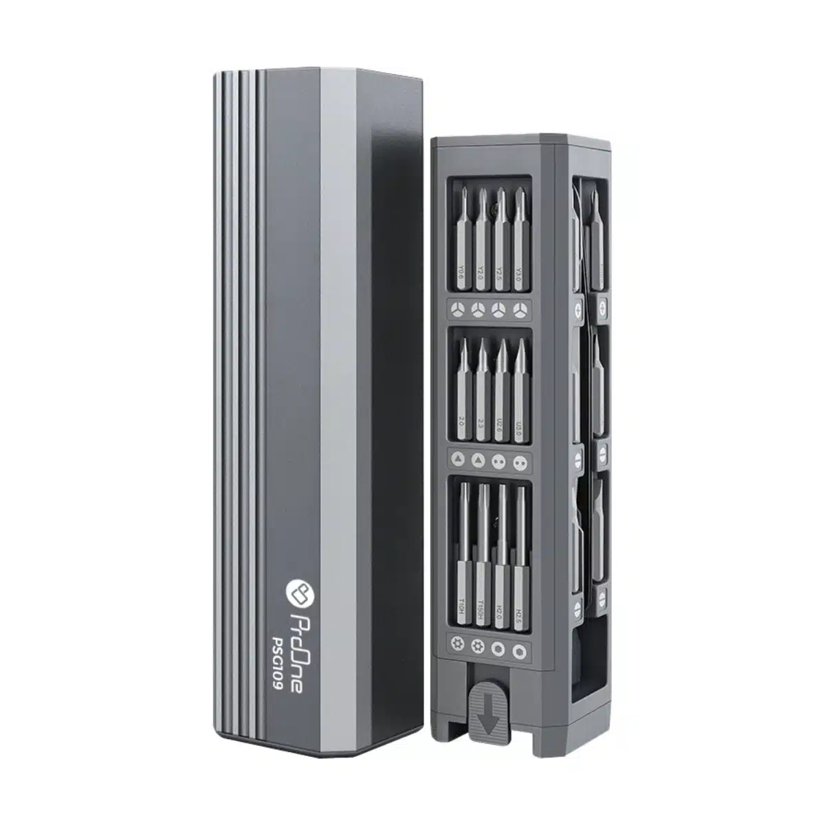 در بستهبندی این مدل، ۴۲ سری فلزی دقیق قرار گرفته که از جنس فولاد کروم-وانادیوم و آلیاژ مقاوم S2 ساخته شدهاند. این سریها با طول ۲۸ یا ۳۹ میلیمتر برای پیچهای فوقالعاده ظریف در موبایل، لپتاپ، هدفون، ساعت هوشمند و حتی اسباببازیهای دیجیتال طراحی شدهاند. انواع سریهای دوسو، چهارسو، ستارهای، پنجپر، ششپر، مربعی، Y شکل، U شکل، سهگوش و سریهای امنیتی خاص همگی در این مجموعه دیده میشود. در کنار آنها، یک انبر ضدزنگ ۱۲ سانتیمتری برای برداشتن قطعات ریز، یک اهرم فولادی کوچک برای باز کردن قابها، و یک صفحهی نگهدارندهی پیچها هم در این مجموعه قرار دارد. همهی اینها در جعبهای منظم با قفل مغناطیسی قرار دارند تا چیزی گم نشود یا جا نماند.